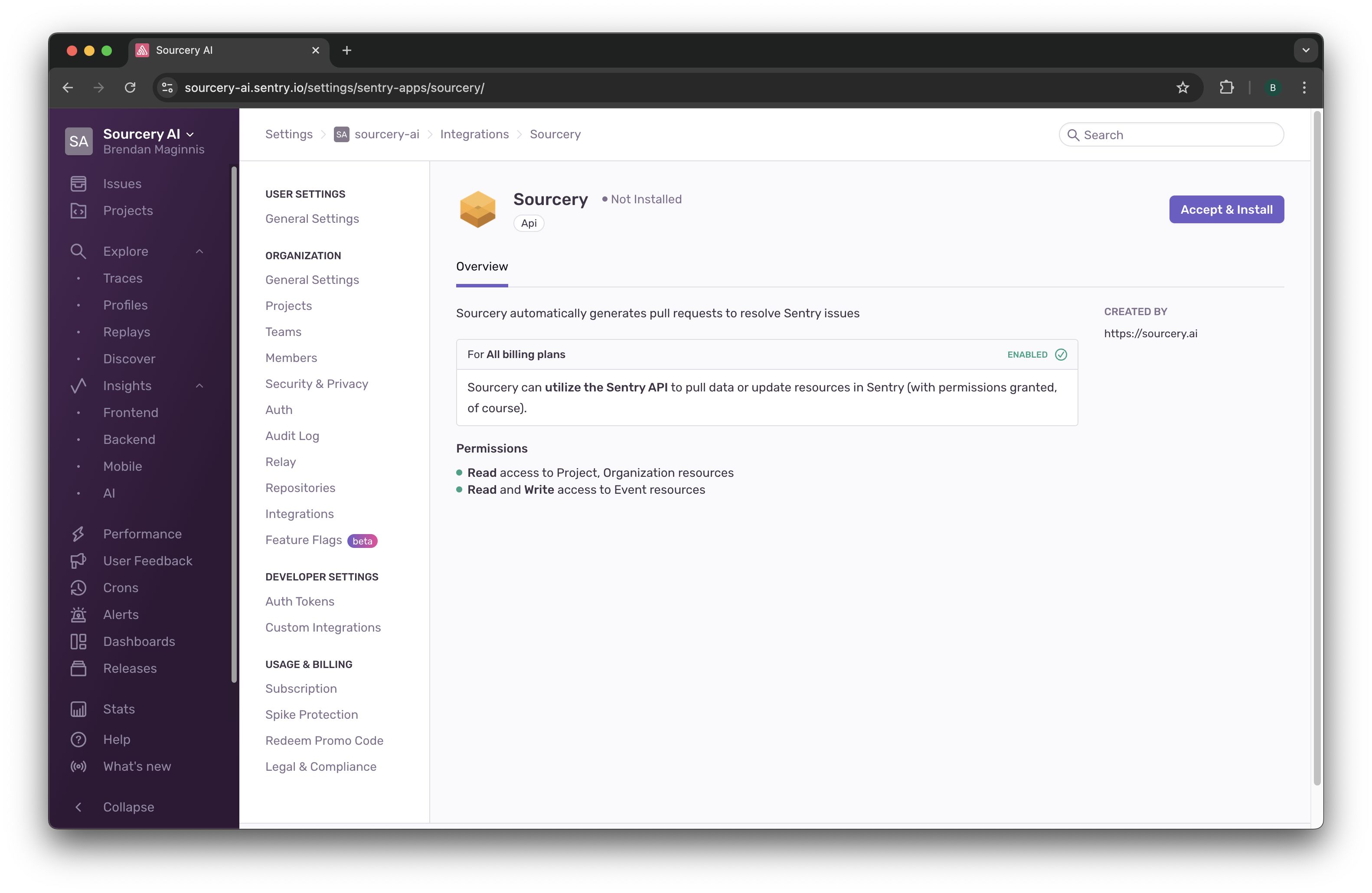 Click "Accept and install" to connect your Sentry account to Sourcery.