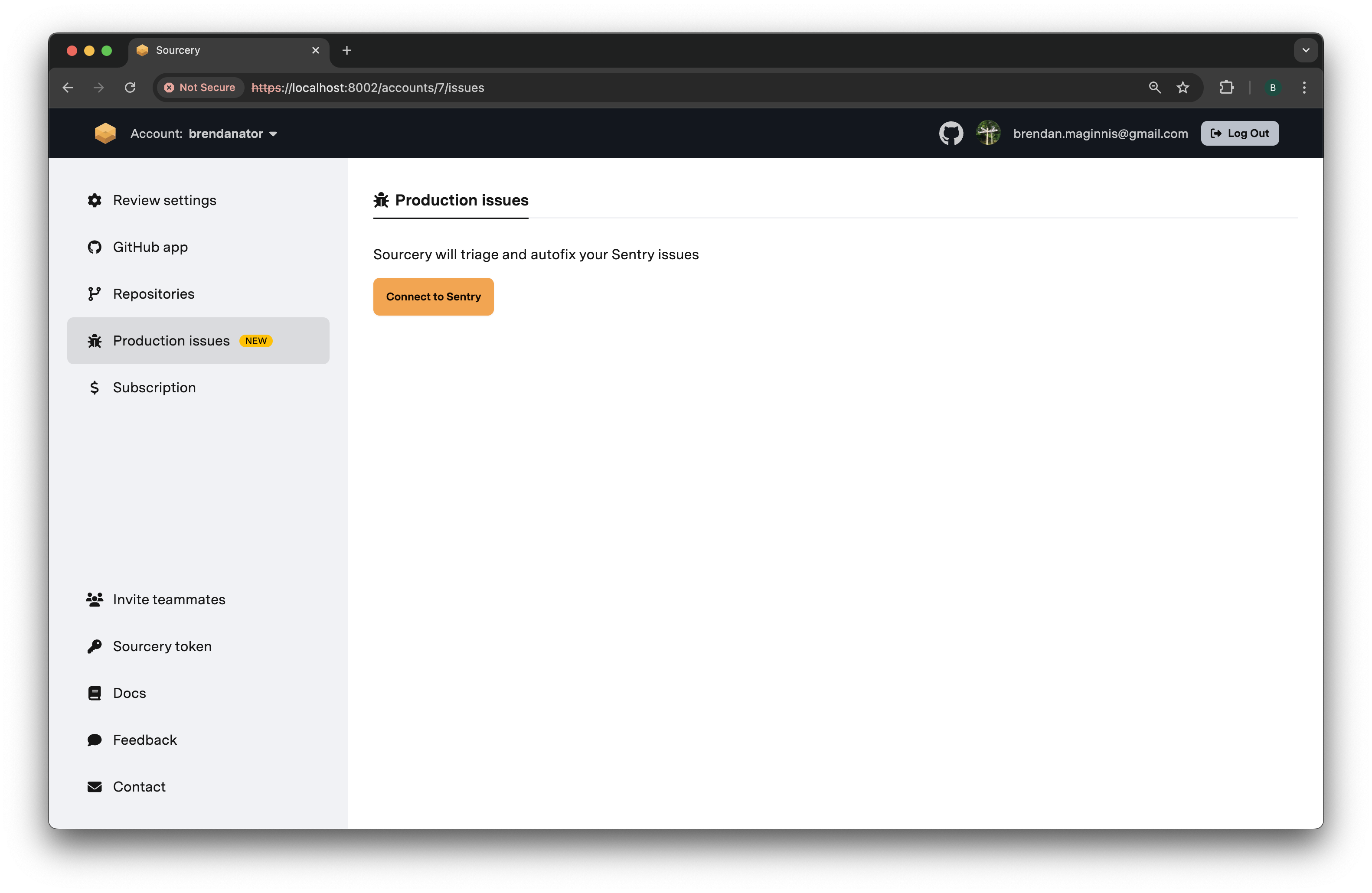Navigate to the Production issues page in the Sourcery dashboard and click on the "Connect to Sentry" button.