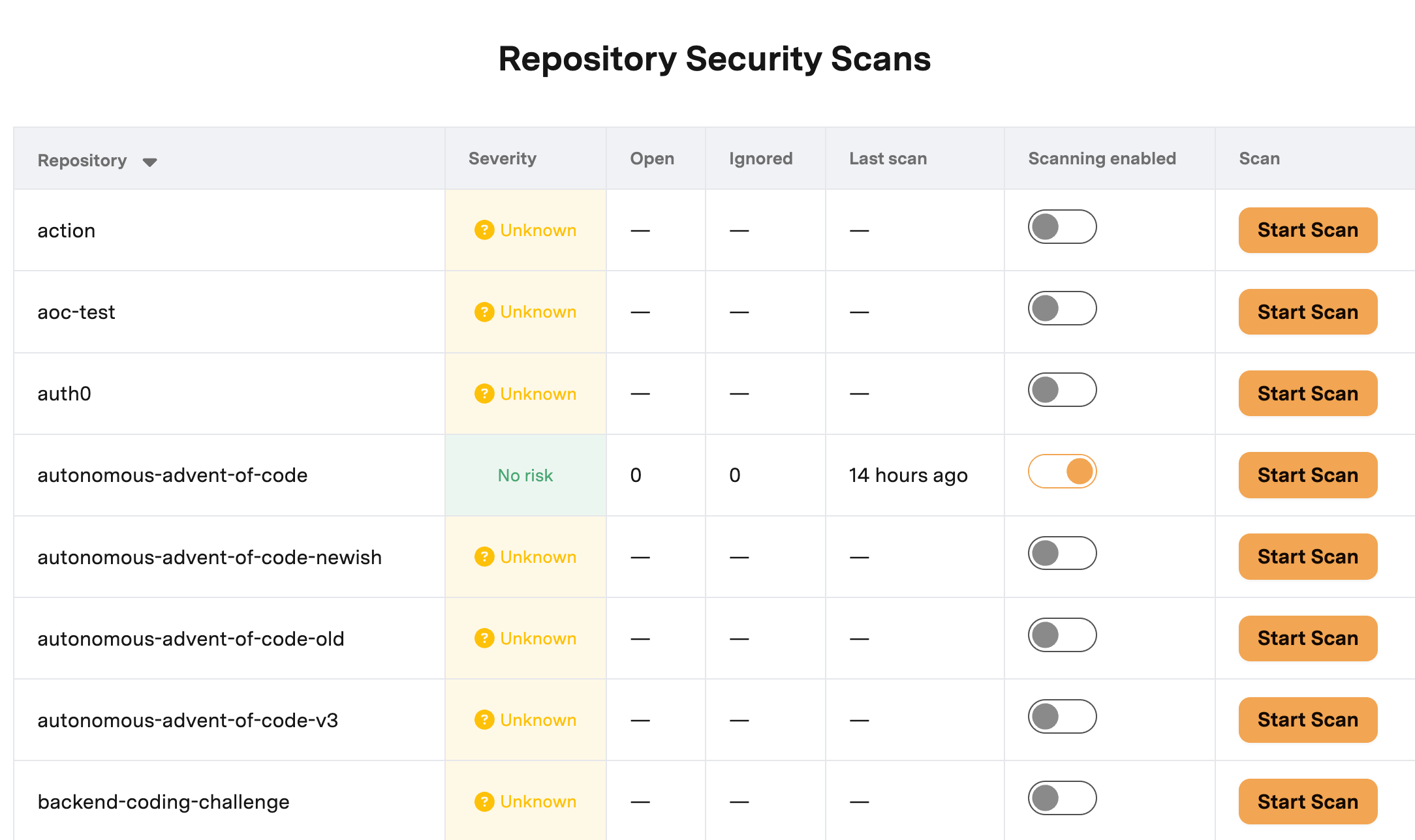 Once you do, you can manage which repos are scanned from the Repository Security Scans section of your Sourcery dashboard.