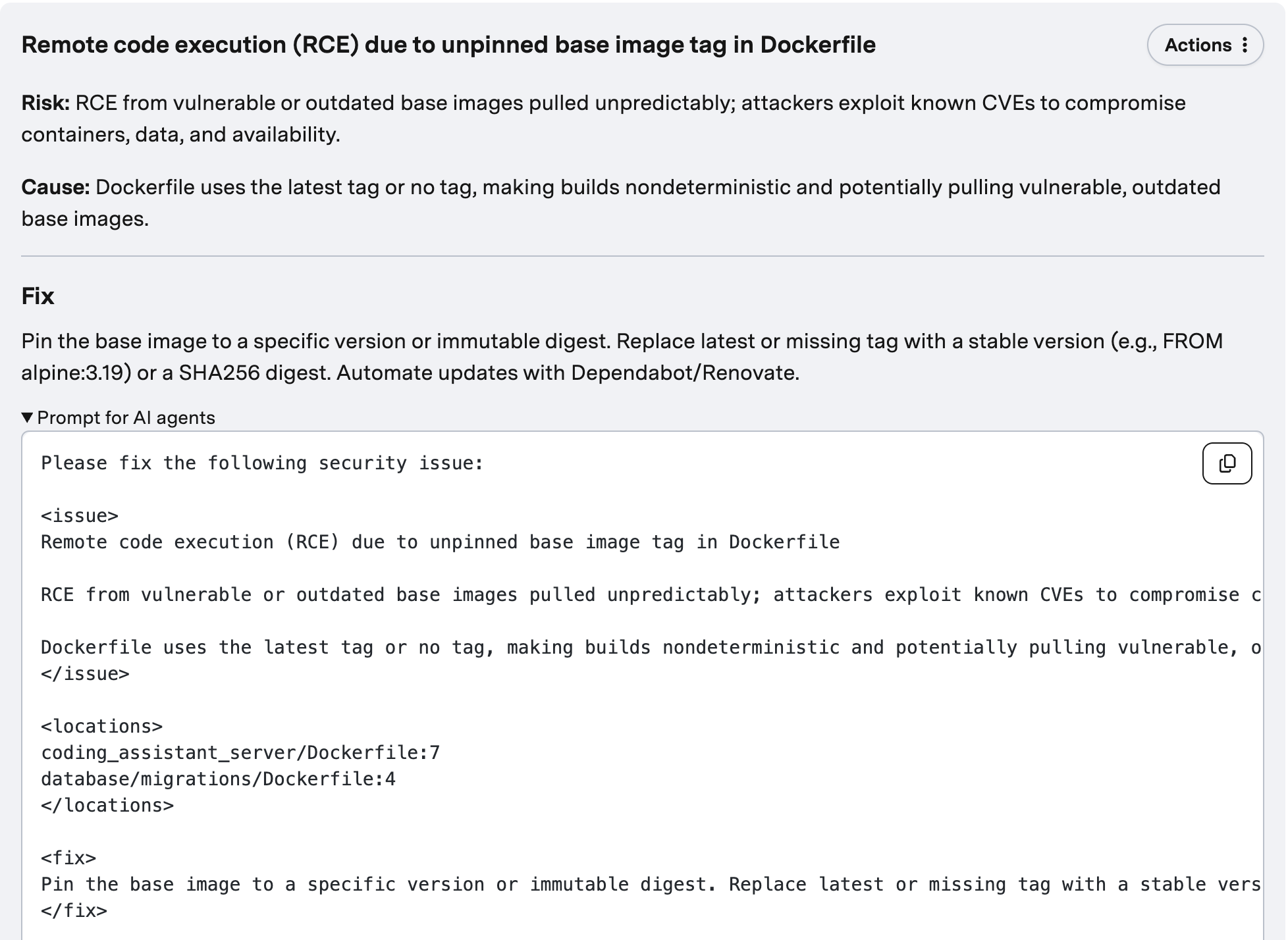 Sourcery will provide instructions on how you can fix any security issue we identify. Click into the issue on the dashboard to see the fix as well as any notes or considerations about the fix.